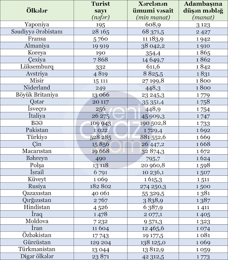 Onu da bildirək ki, Azərbaycandan gedən turistlər çox Yaponiyada pul xərcləyiblər. Ötən il Yaponiyaya 195 nəfər azərbaycanlı turist gedib və onların hər biri orta hesabla 3 123 manat xərcləyib. Ən az pul xərcləyənlər Türkmənistana səfər edən turistlər olub. Türkmənistana son bir il ərzində 13 dəq 44 azərbaycanlı turist gedib və onların hər biri 1 059 manat xərcləyib.
